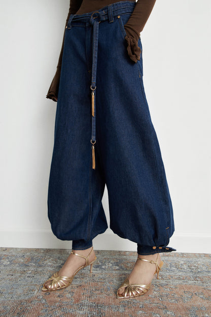 Loose-fit jeans in cotton and lyocell blend. Mid waist with button, diagonal side and back pockets. Narrow, extra-long tie belt with tassels that wraps around waist. Wide legs with snap buttoned cuffs.