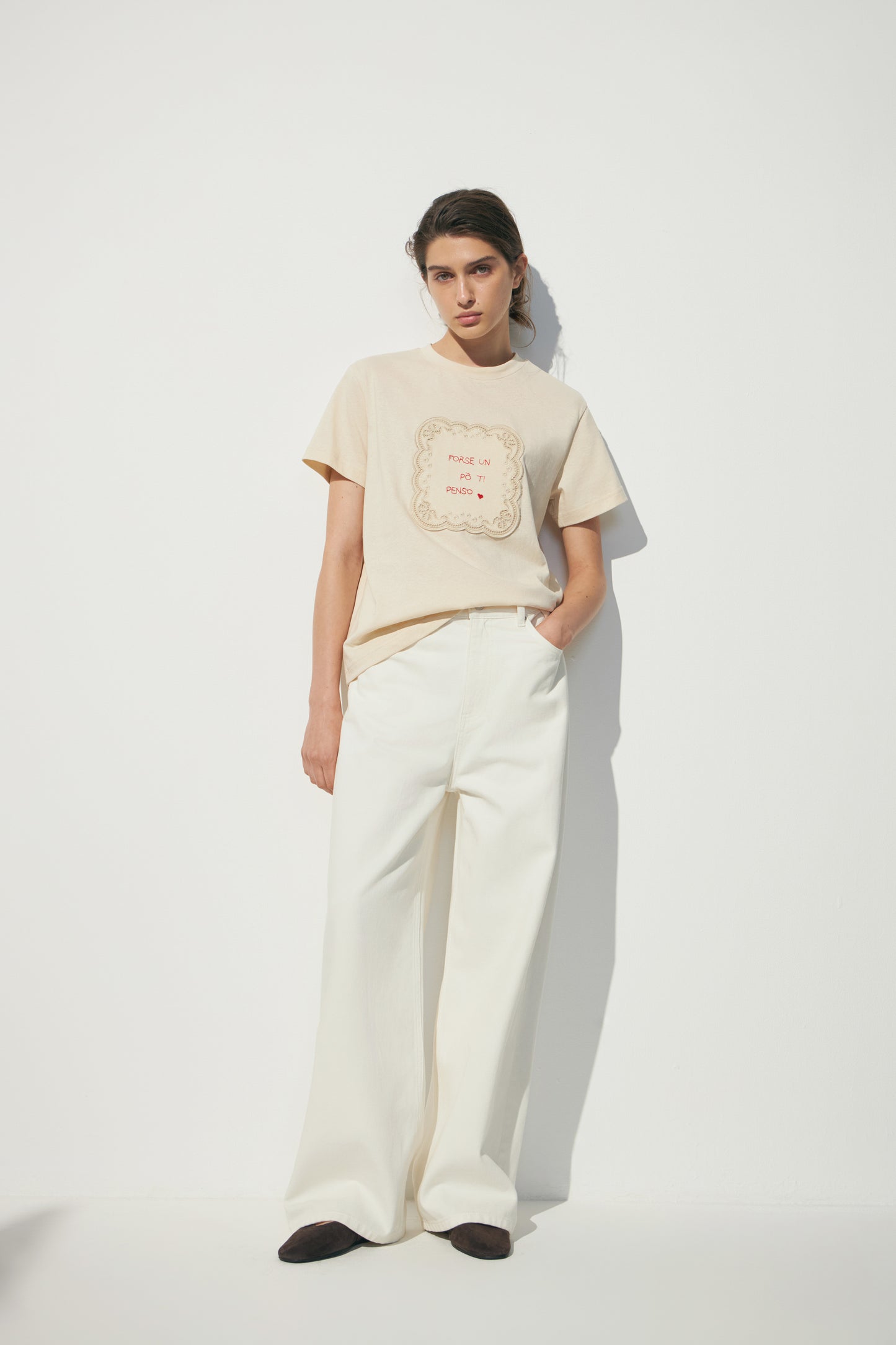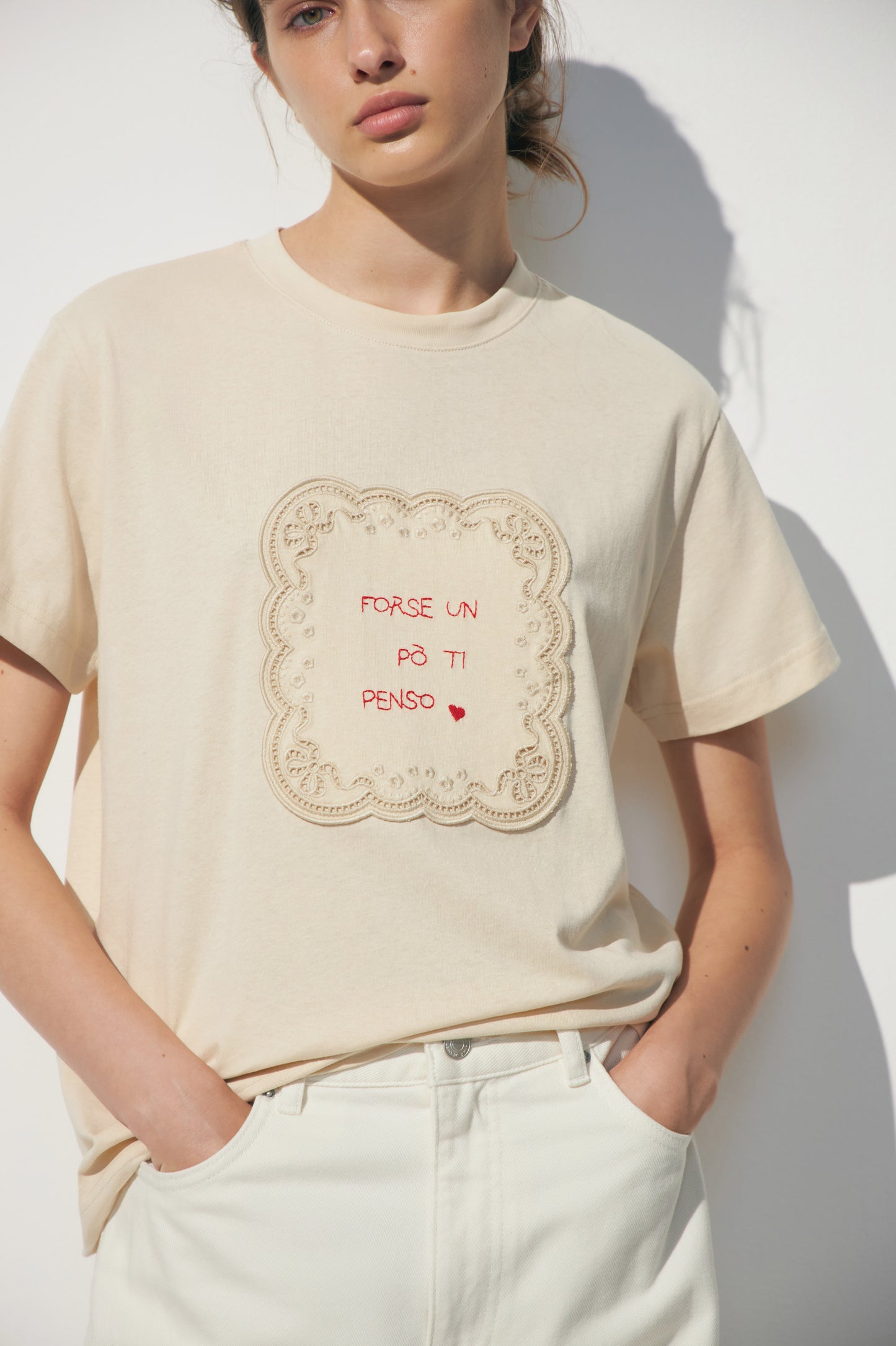 T-shirt in cotton jersey. Round neckline, short sleeves, and a straight-cut hem. Decorated on the chest with an embroidered patch appliqué.