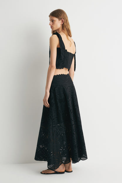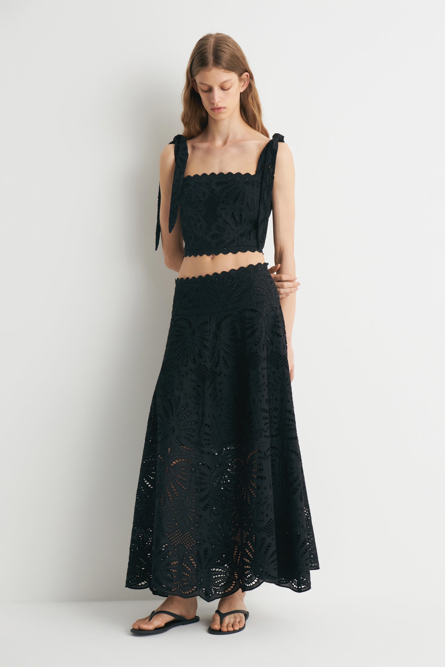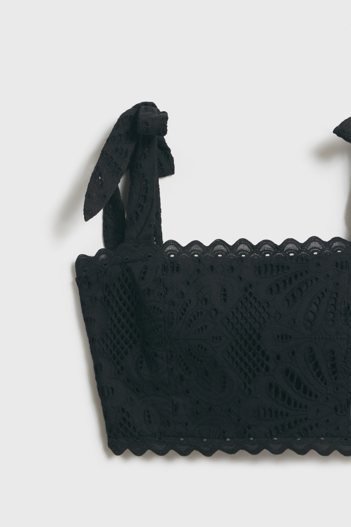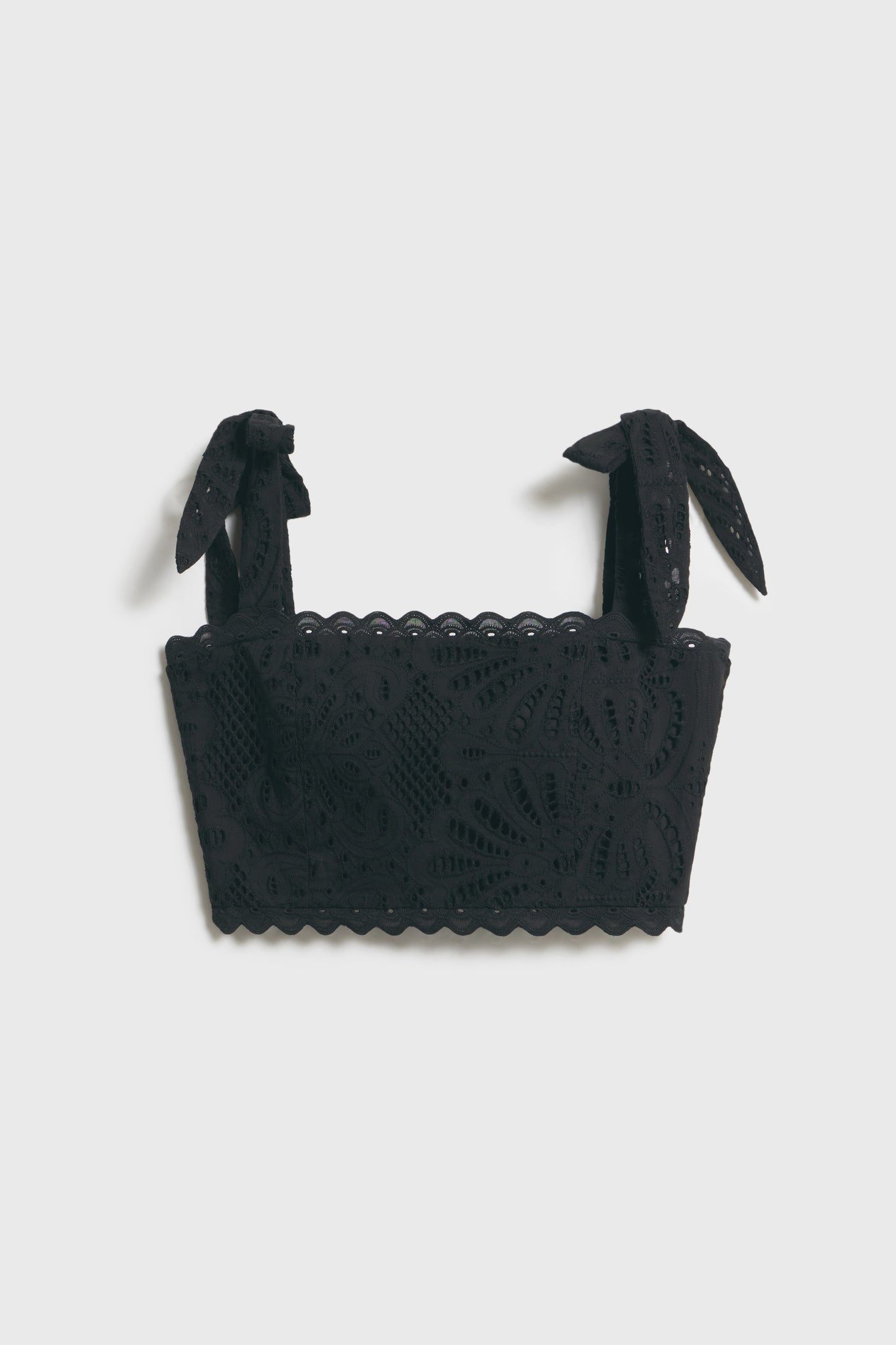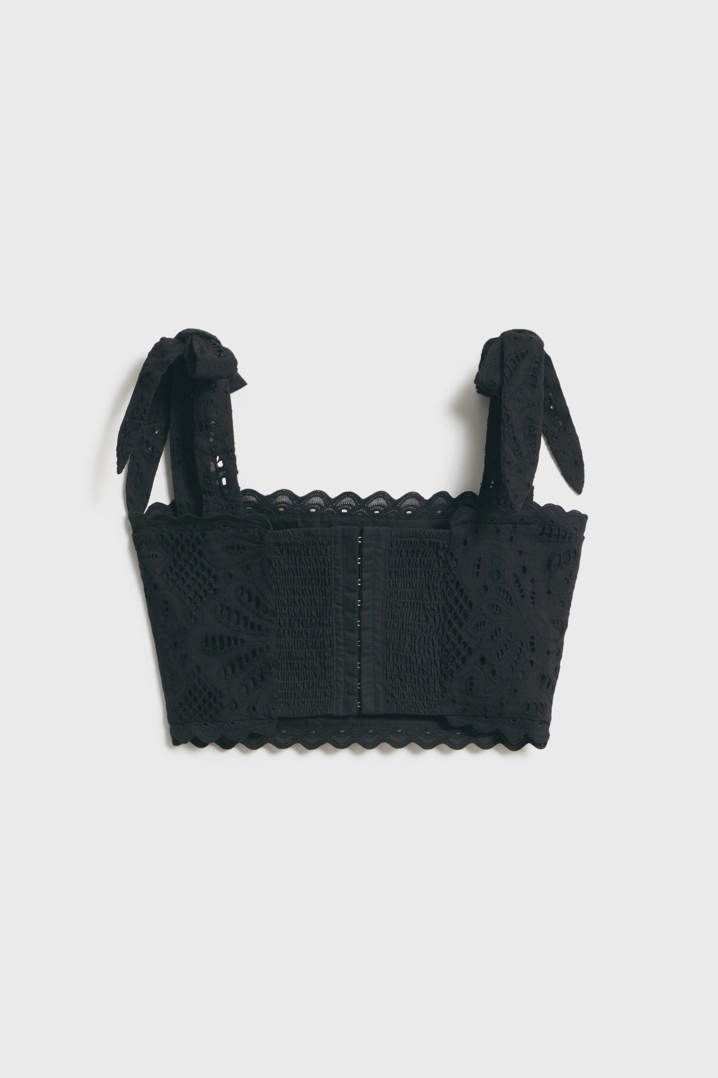 Cropped top with a fitted, smocked bodice in a cotton weave with accent all-over embroidery. Wide tie-top shoulder straps and scalloped edges at the hem and neckline. Lined. Hook-and-eye fastening at the back.