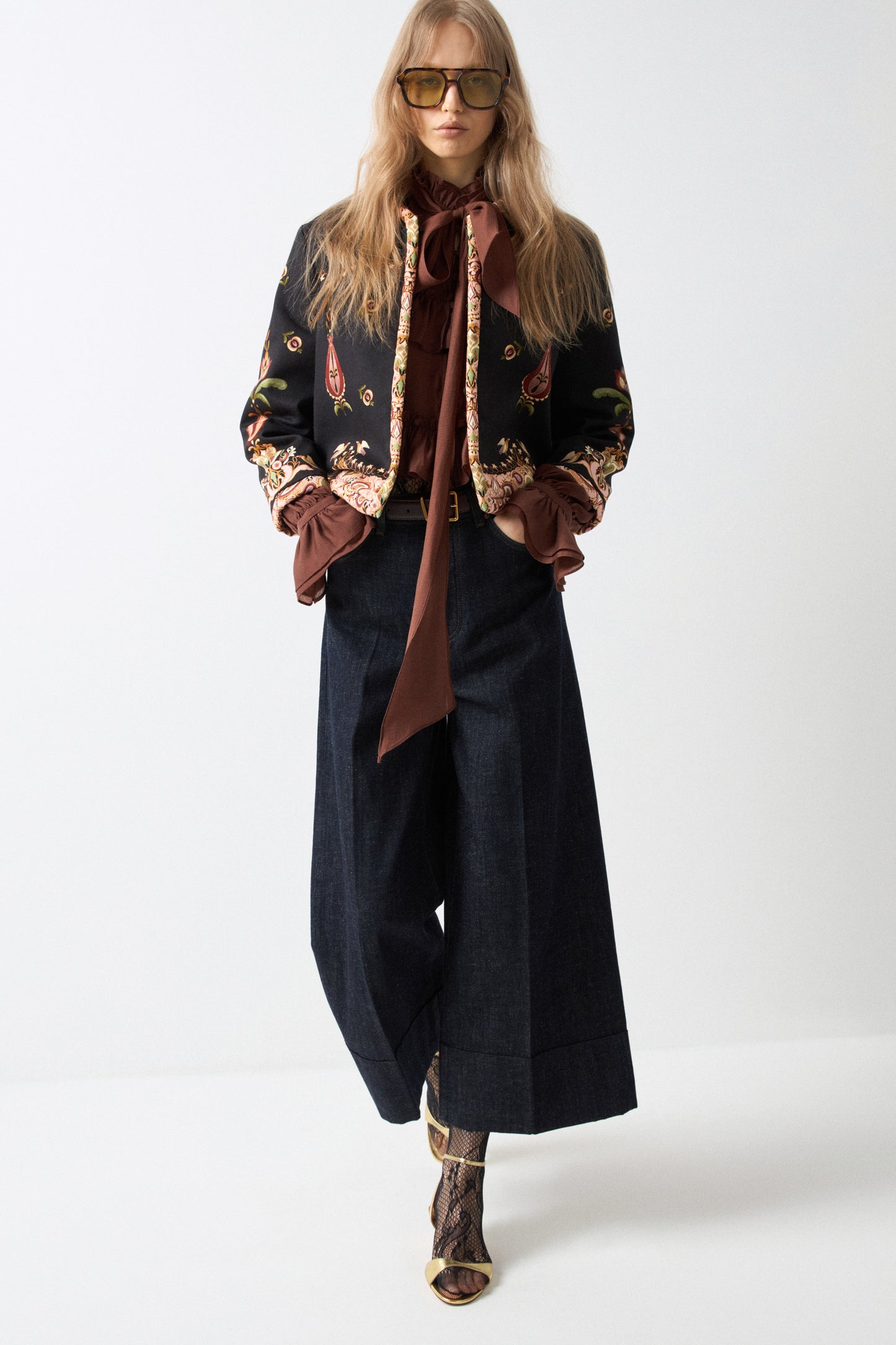 Boxy jacket in cotton made unique by its texture and precious floral motif embellishments. Round neckline, covered hooks fasteners at front and long sleeves. Lined.