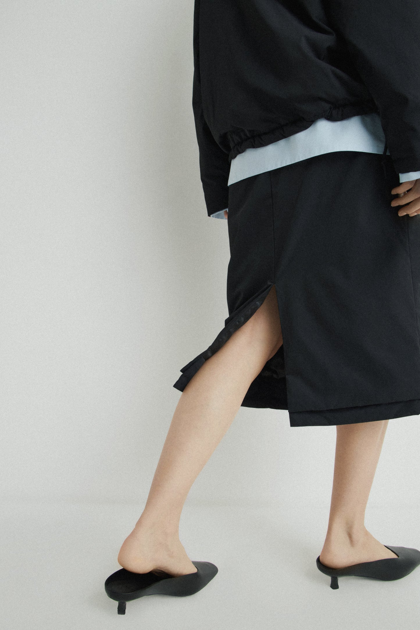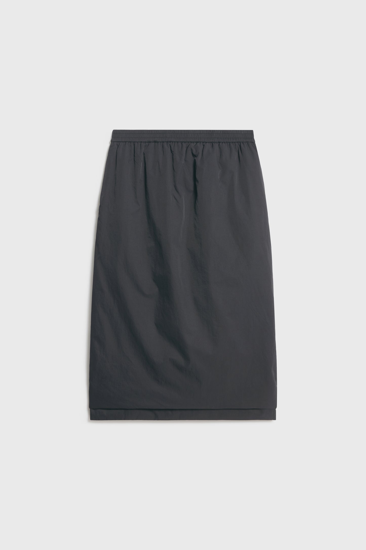 Knee-length, lightly padded skirt in water-repellent nylon. Covered elastic at the waistband, and diagonal side pockets. Lined.